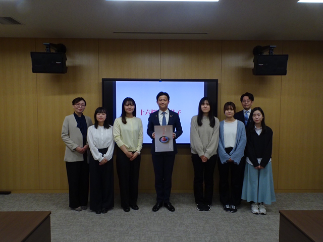 今回、完成を記念して松江市長を表敬訪問し、開発に至るまでの経緯や和菓子に込めた想いを学生たちが報告しました。市長には実際に「十六桜」をご試食いただき、「十六桜」の美しい見た目や上品な甘さ、繊細な味わいを高く評価していただきました。
