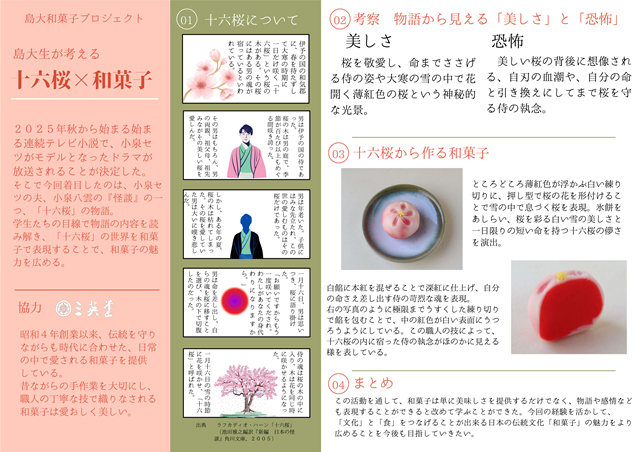 小泉八雲の怪談から着想を得て、物語を和菓子で表現した特製生菓子「十六桜」が、松江市の和菓子老舗・三英堂と島大和菓子プロジェクトに所属する学生の共同開発により誕生しました。薄紅色が浮かぶ白い練り切りに、押し型で桜の花を形付けることで真冬の雪の中で息づく桜を表現した生菓子は、「十六桜」という物語と和菓子の美しい融合となっています。