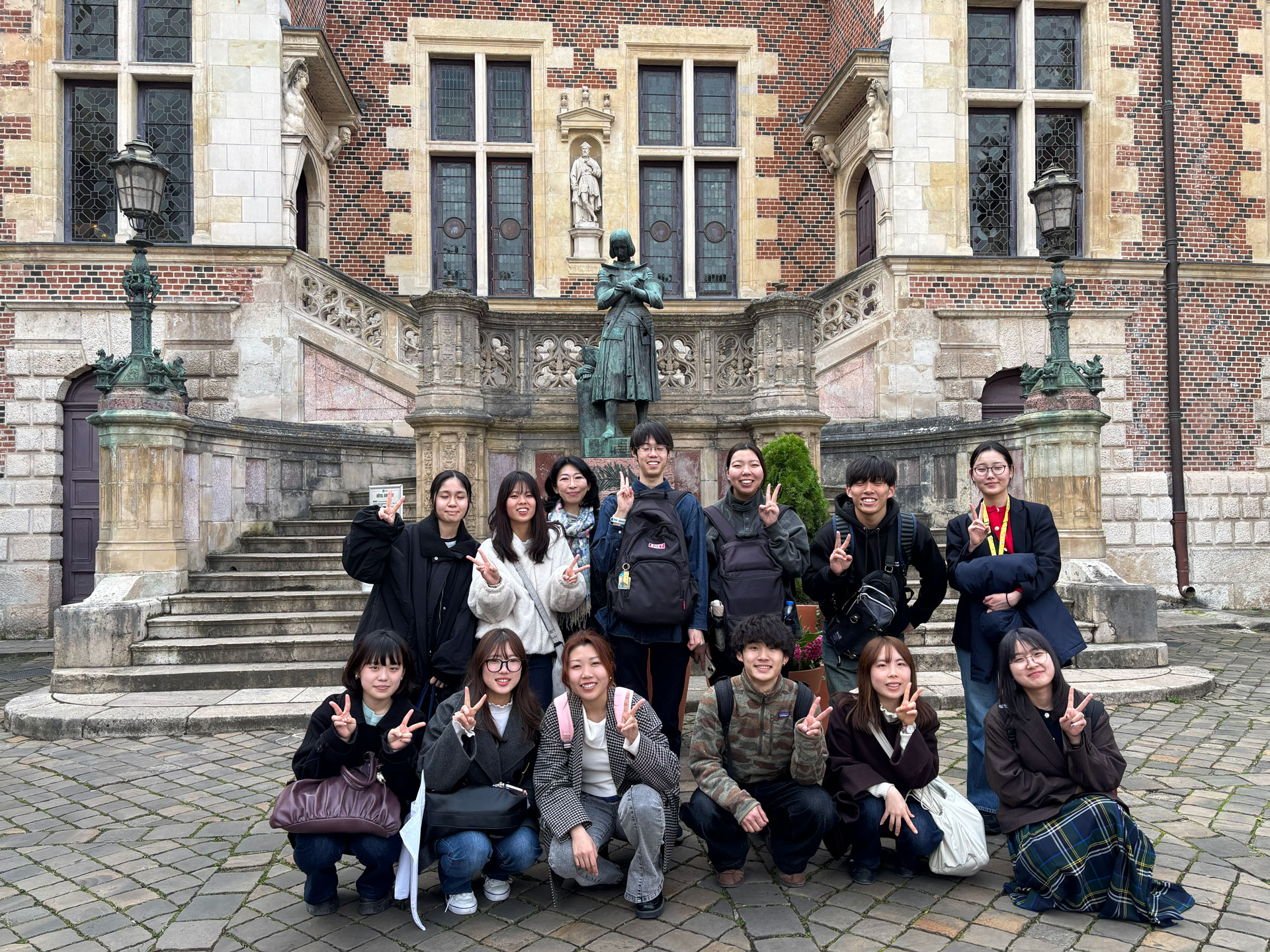 3月に協定校のオルレアン大学で行われた語学・文化研修に、全学から12名、そのうち法文学部から4名の学生が参加しました。約20日間、学生たちは教室での実践的なオーラルコミュニケーションを中心とした授業に取り組み、さらにモン・サン・ミッシェルやロワール地方の古城など、フランスを代表する歴史的な場所を訪れ、本や映像で見ていた世界を自分の目で体験しました。滞在はホームステイ形式で、フランスの家庭で過ごしながら、言葉だけでなく生活習慣や価値観の違いにも直接触れる貴重な経験を重ねました。学生からは、「言葉や文化、歴史、社会を知ることで、自分の勉強や専門分野を今までと違う視点で考えられるようになった」「他の世界を知ることの大切さを実感した」といった声が聞かれました。また、学部を超えて参加した学生同士の交流も大きな刺激となり、「これまで興味のなかった分野にも関心が広がった」「他の国や地域での研修やインターンシップにも挑戦してみたい」と、それぞれが次の目標に向けて意欲を高めるきっかけにもなったようです。